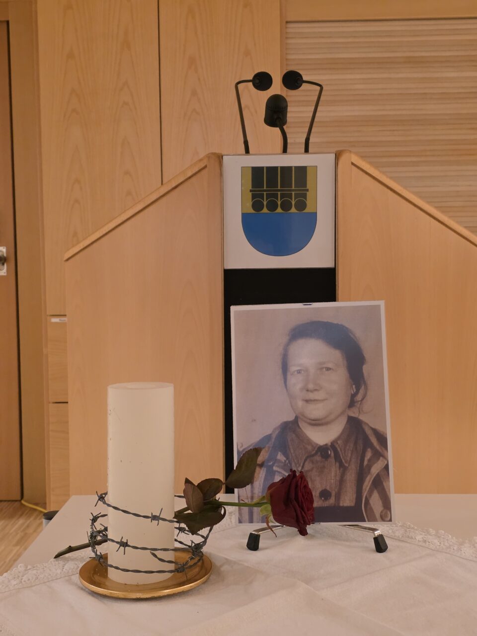 Im MIttelpunkt stand Sr. Angela Autsch aus Mötz. Die Kerze steht für das Gedenken, Rose und Stacheldraht für ihr "blühendes Lächeln im Lager".